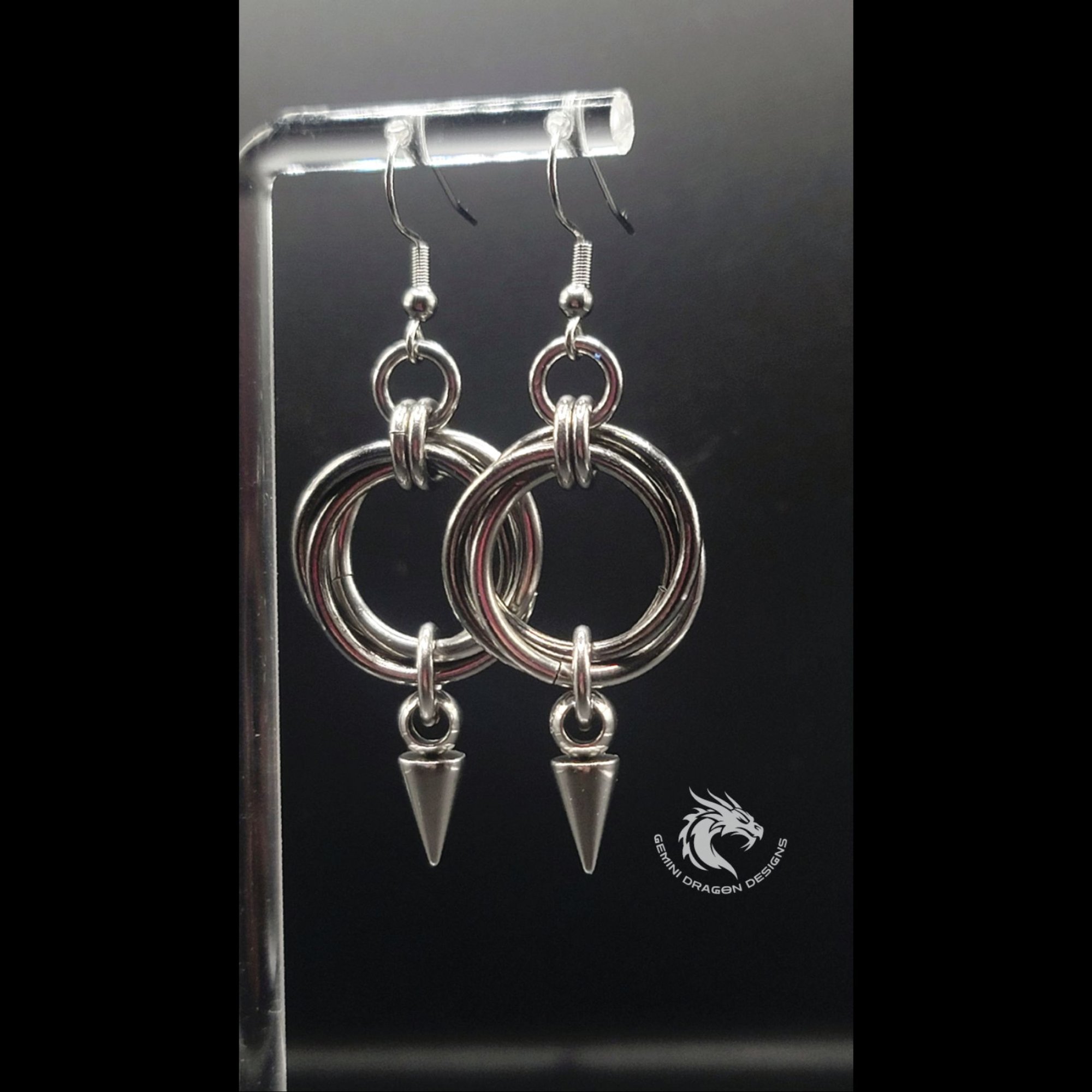 Edgy stainless steel spike hoop earrings featuring layered rings and a gothic dangle design. Hypoallergenic, nickel free, and safe for sensitive ears.