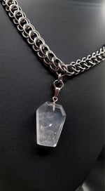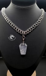 A beautiful half persian design chainmaille necklace with quartz crystal coffin pendant.