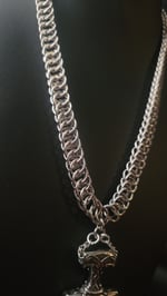 Made with all stainless steel materials! A beautiful Mjölnir helm pendant dangling off a larger chain pattern.